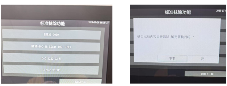 选择好擦除标准后,自动进入擦除工作,工作完成,显示屏会自动亮绿灯提醒,用户可以拔除硬盘,将下一波擦除目标盘插入设备进行擦除任务,轻轻松松一键搞定。