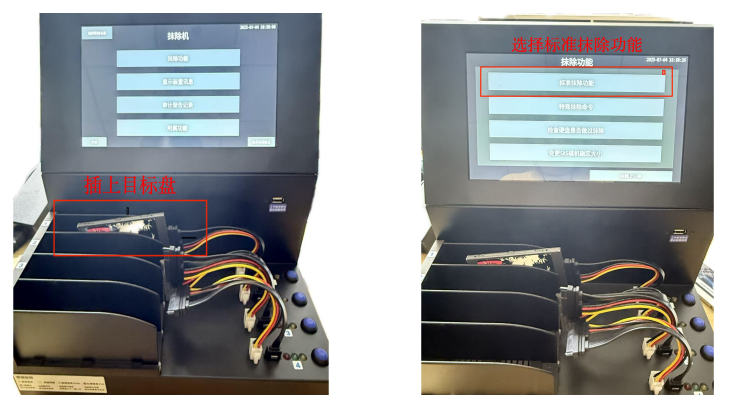 开机之后插上目标盘,如擦除1号口,点选1号口的显示屏会跳出擦除菜单,选择所需要的擦除标准之后会自动执行,绿色灯号闪烁,代表工作中,擦除完成后显示屏会亮绿灯,就可以拔除硬盘。
