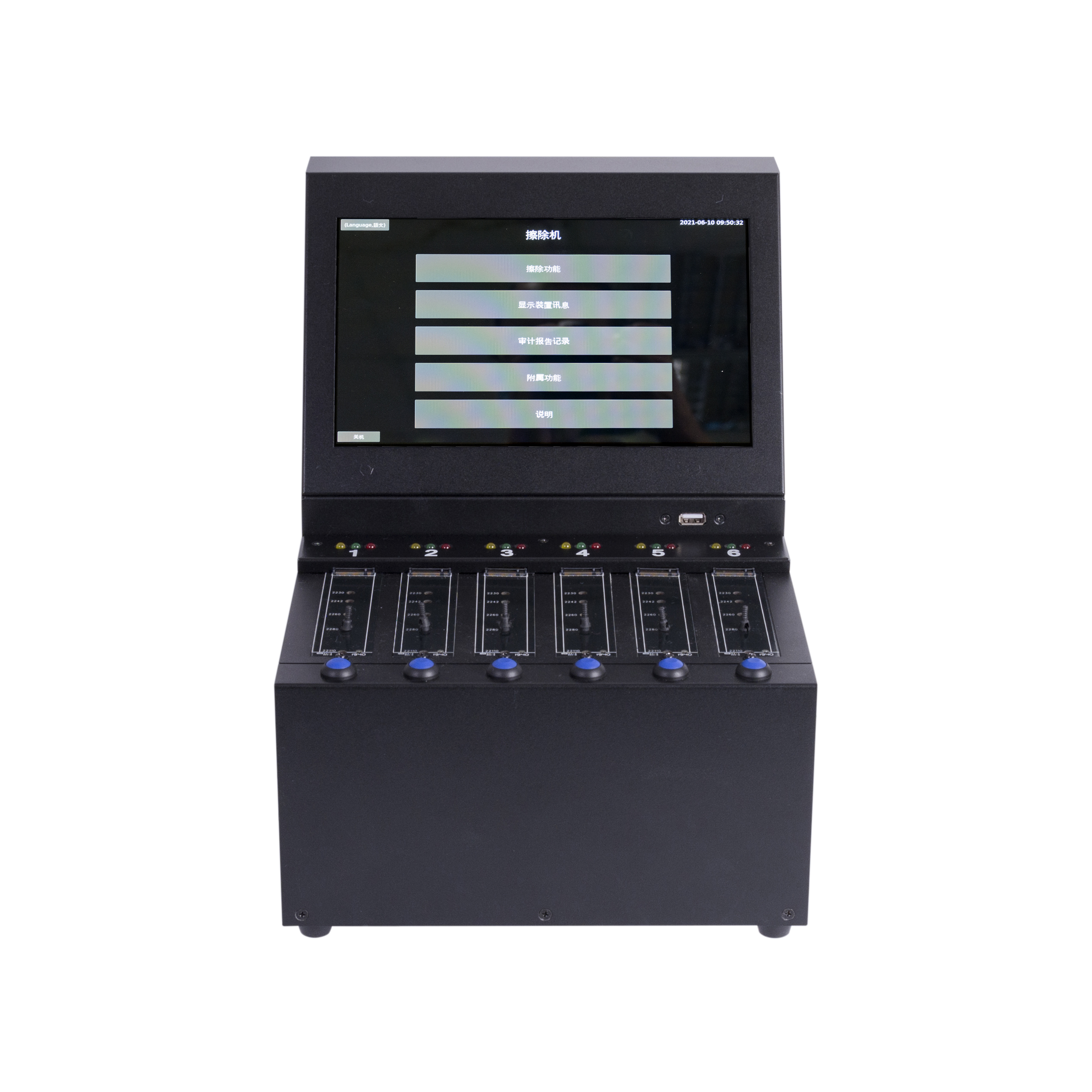 | 1.触控荧幕 2.M.2 SSD硬盘插槽*6 3.蓝色快抹键 4.擦除工作状态LED灯(红、绿、黄) 5.擦除记录输出、韧体更新U盘孔 |